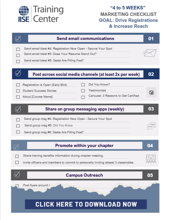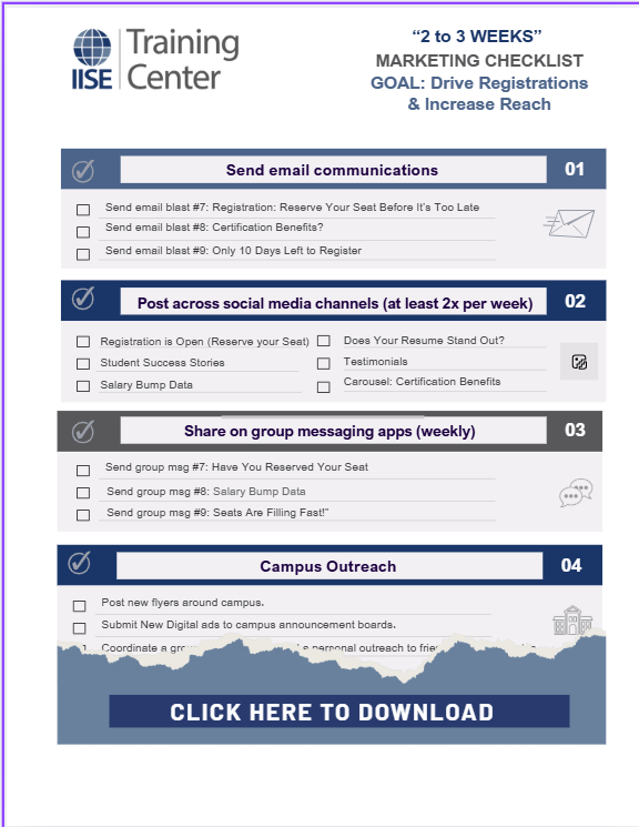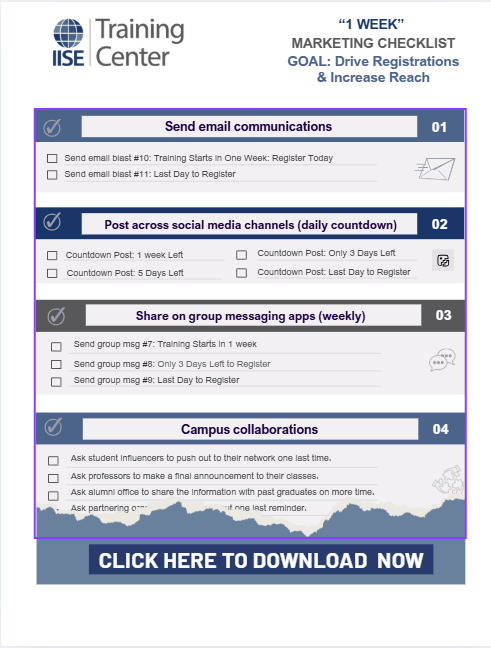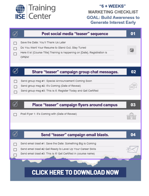 Want a simple, step-by-step way to make sure your training is a success? These checklists cover all the marketing and promotional activities you need—from 6+ weeks before training all the way to the final week before class starts.